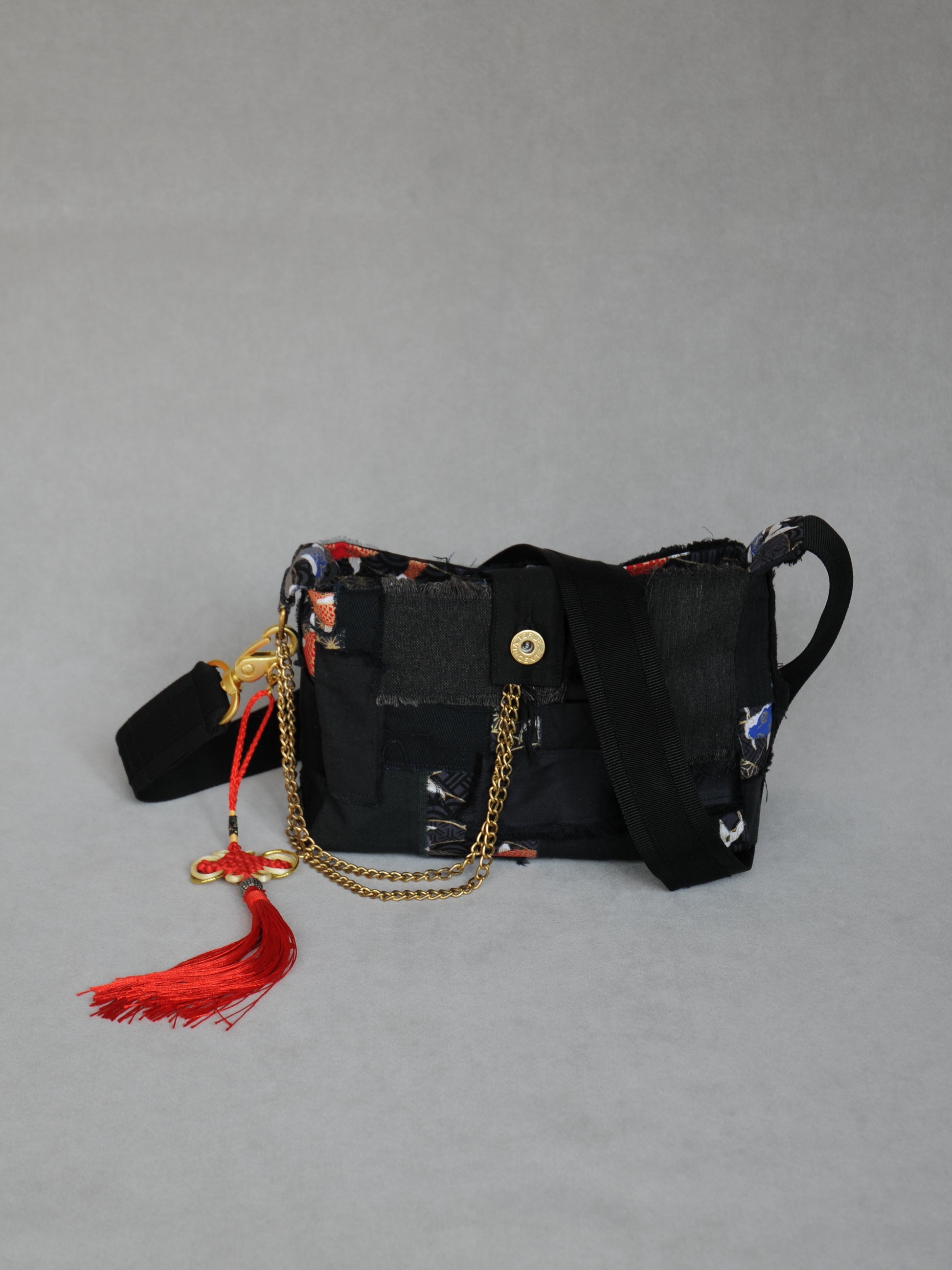One of a kind puzzle bag made of different cotton, wool, linen and silk fabrics.