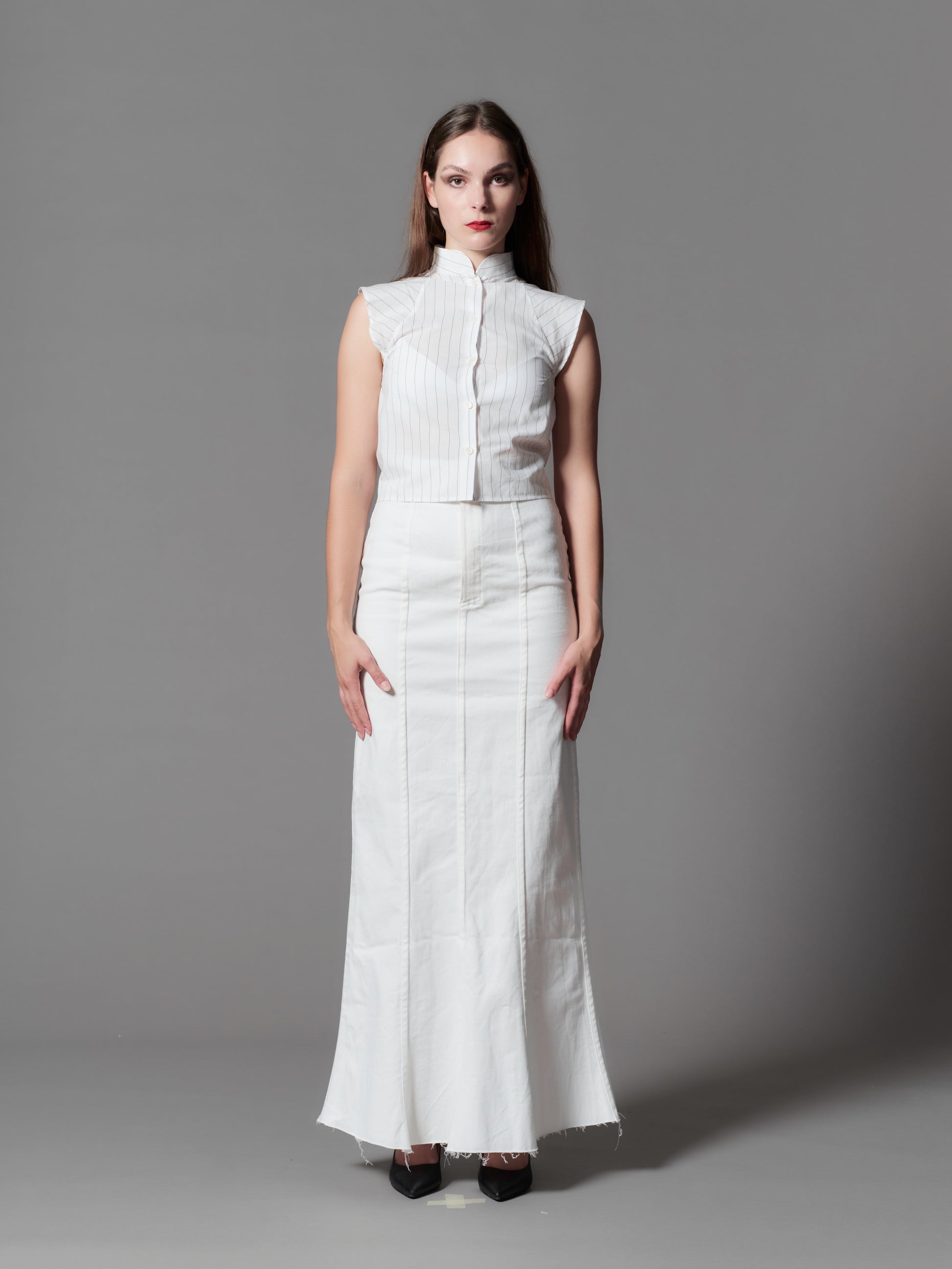 Short sleeve pinstripe blouse.