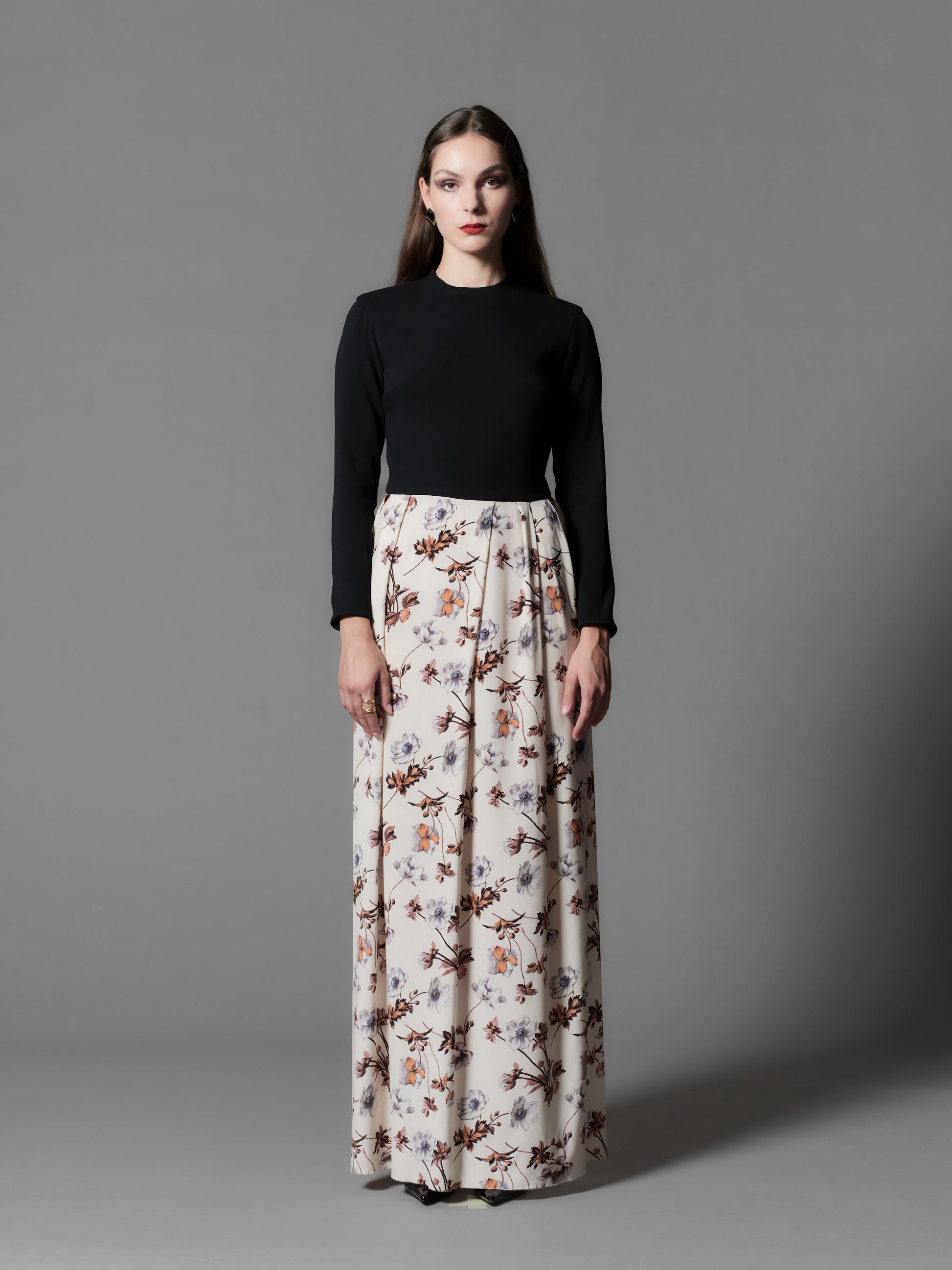 Floor length evening dress with floral print.